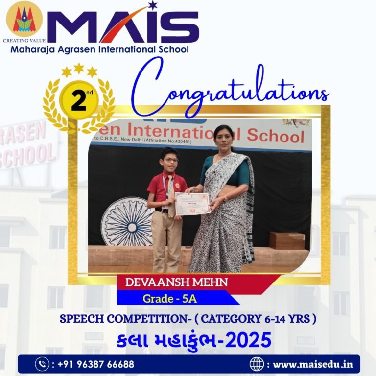 We are proud to announce that Devaansh Mehn, a talented student of Grade 5A, has secured 2nd Place in the Speech Competition (Category 6β14 years) at Kala Mahakumbh 2025.